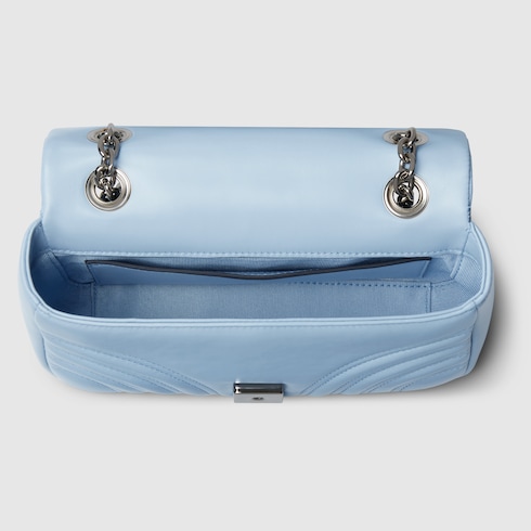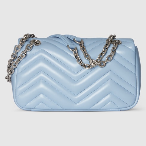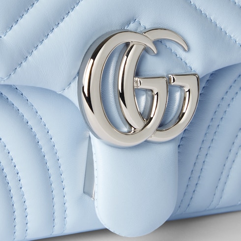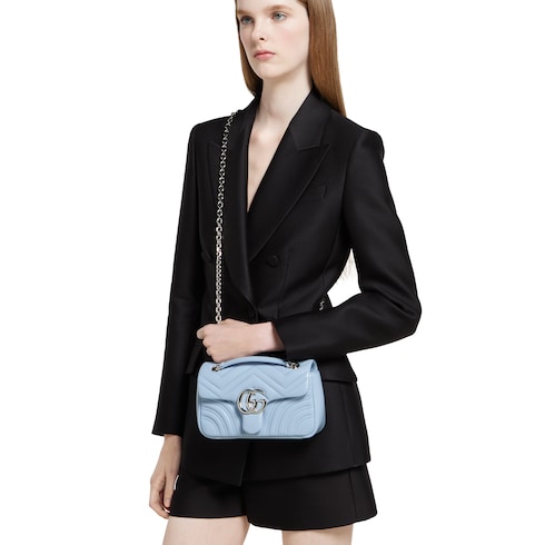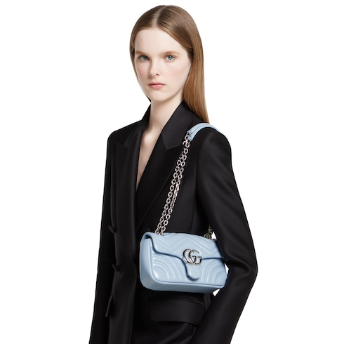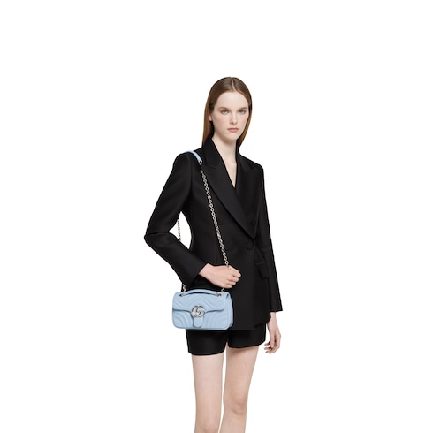 คอลเล็กชั่น GG Marmont อันเป็นเอกลักษณ์ของแบรนด์นำเสนอด้วยฮาร์ดแวร์ Double G สายโซ่แบบเหลี่ยมมุม และโครงสร้างอันนุ่มนวลที่ผสานกับหนังที่อ่อนนุ่มเป็นพิเศษ