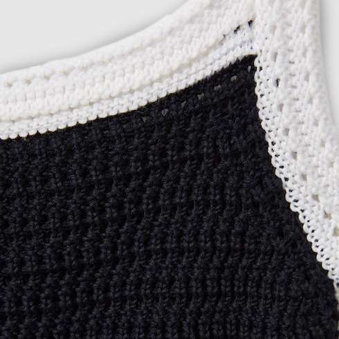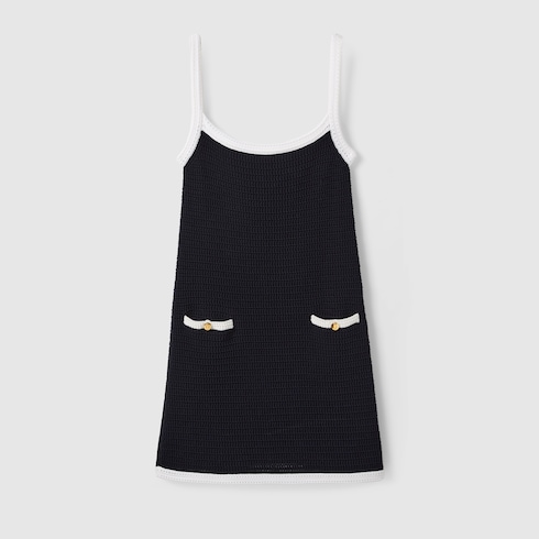 เดรสชุดนี้เป็นส่วนหนึ่งของคอลเล็กชั่น Cruise 2025 ในผ้าคอตตอนเนื้อละเอียด เฉดสีกรมท่าช่วยเพิ่มความรู้สึกที่ประณีตของเนื้อผ้า พร้อมตกแต่งเพิ่มเติมด้วยกระดุมยอดมงกุฎโทนสีทอง