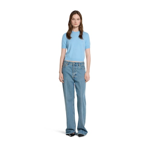 สำหรับคอลเล็กชั่น Pre-Fall 2025 เสื้อและเดรสสีสันสดใสช่วยเติมเต็มไอเท็มเสื้อผ้าด้วยลูกเล่นสีสันสดใสเพื่อสร้างลุคแห่งการเปลี่ยนผ่าน เสื้อผ้าแคชเมียร์ตัวนี้นำเสนอด้วยเฉดสีสันที่ละเอียดอ่อนพร้อมด้วยรายละเอียดอินทาร์เซีย Gucci