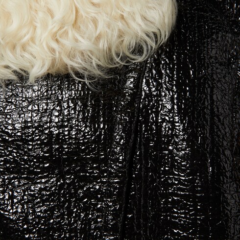 ผ้าขนแกะเผยให้เห็นถึงงานฝีมืออันหรูหราและคุณภาพเหนือระดับ ผสมผสานผิวสัมผัสที่ทันสมัยและหรูหราเข้ากับเสื้อผ้าชั้นนอกสุดคลาสสิกผ่านรูปทรงโอเวอร์ไซส์ที่ชวนระลึกถึงความหรูหราแห่งยุค 1990 เสื้อแจ็คเก็ตบอมเบอร์ตัวนี้รังสรรค์ด้วยผ้าฝ้ายวิสโคสเคลือบสีดำ พร้อมตกแต่งด้วยปกคอผ้าขนแกะแบบถอดได้