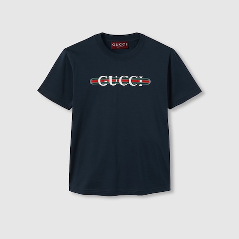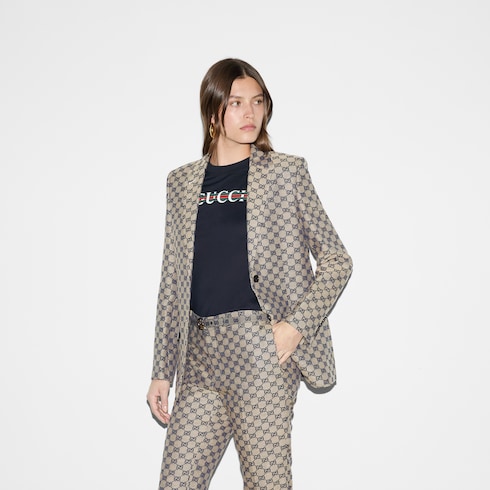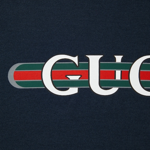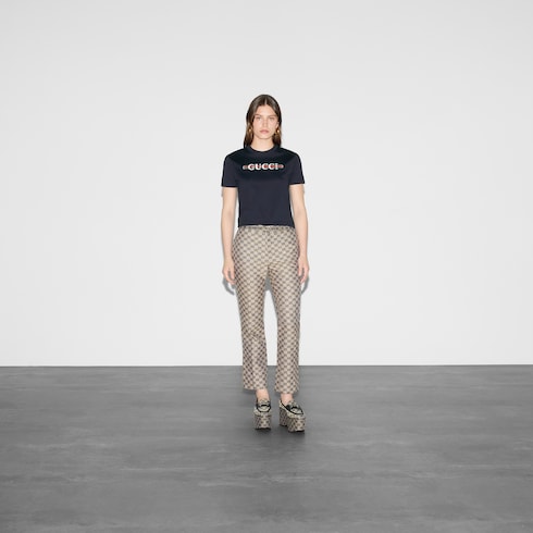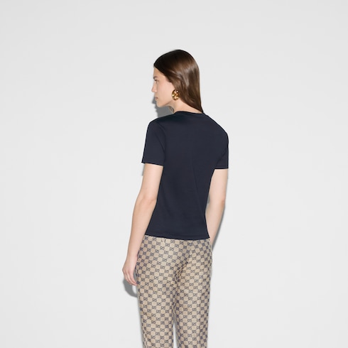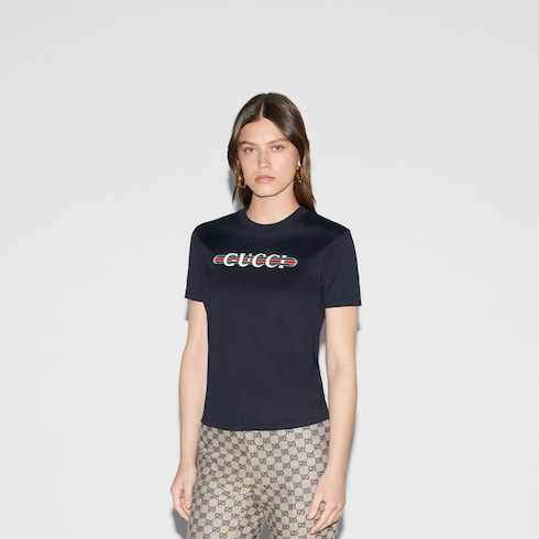 ไอเท็มนี้เป็นส่วนหนึ่งของ Gucci Lido ที่ได้รับแรงบันดาลใจจากจิตวิญญาณซัมเมอร์และบีชคลับตามชายฝั่งอิตาลี สัญลักษณ์อันเป็นเอกลักษณ์ของแบรนด์และลวดลายอันประณีตผ่านการตีความขึ้นใหม่ในสไตล์ร่วมสมัยสำหรับคอลเล็กชั่น Pre-Fall เสื้อยืดตัวนี้นำเสนอในรูปแบบผ้าคอตตอนเจอร์ซีย์เนื้อบางสีกรมท่า และตกแต่งด้วยลายพิมพ์ Gucci Web