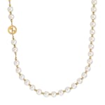 A Round Interlocking G pendant detail is accompanied by a new pearl boule chain to define this necklace. A matching bracelet and shorter necklace design feature the same easy sliding closure with a push button.