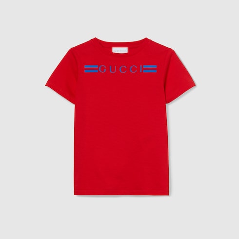 Desde sutiles bordados hasta estampados integrales, los emblemas exclusivos continúan realzando la colección infantil Pre-Fall 2025. Esta camiseta infantil se ha confeccionado en punto de algodón con un estampado de logotipo Gucci con rayas.