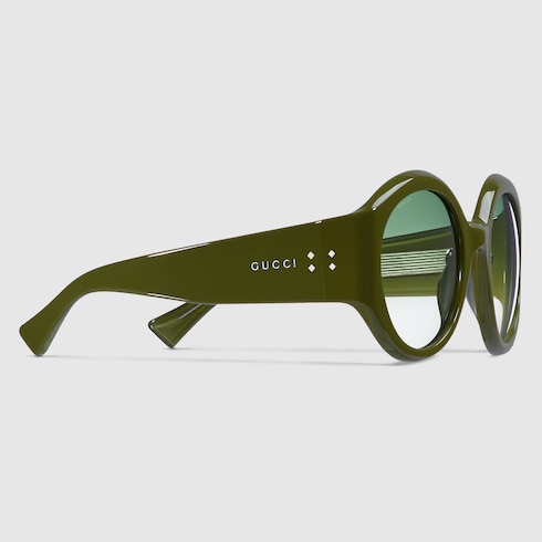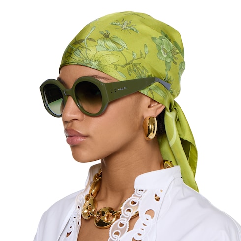 La colección de gafas Pre-Fall 2025 cuenta con diseños clásicos que combinan una estética sencilla y motivos exclusivos. Estas gafas de sol de montura redonda exhiben un detalle de logotipo Gucci con remaches en las patillas.