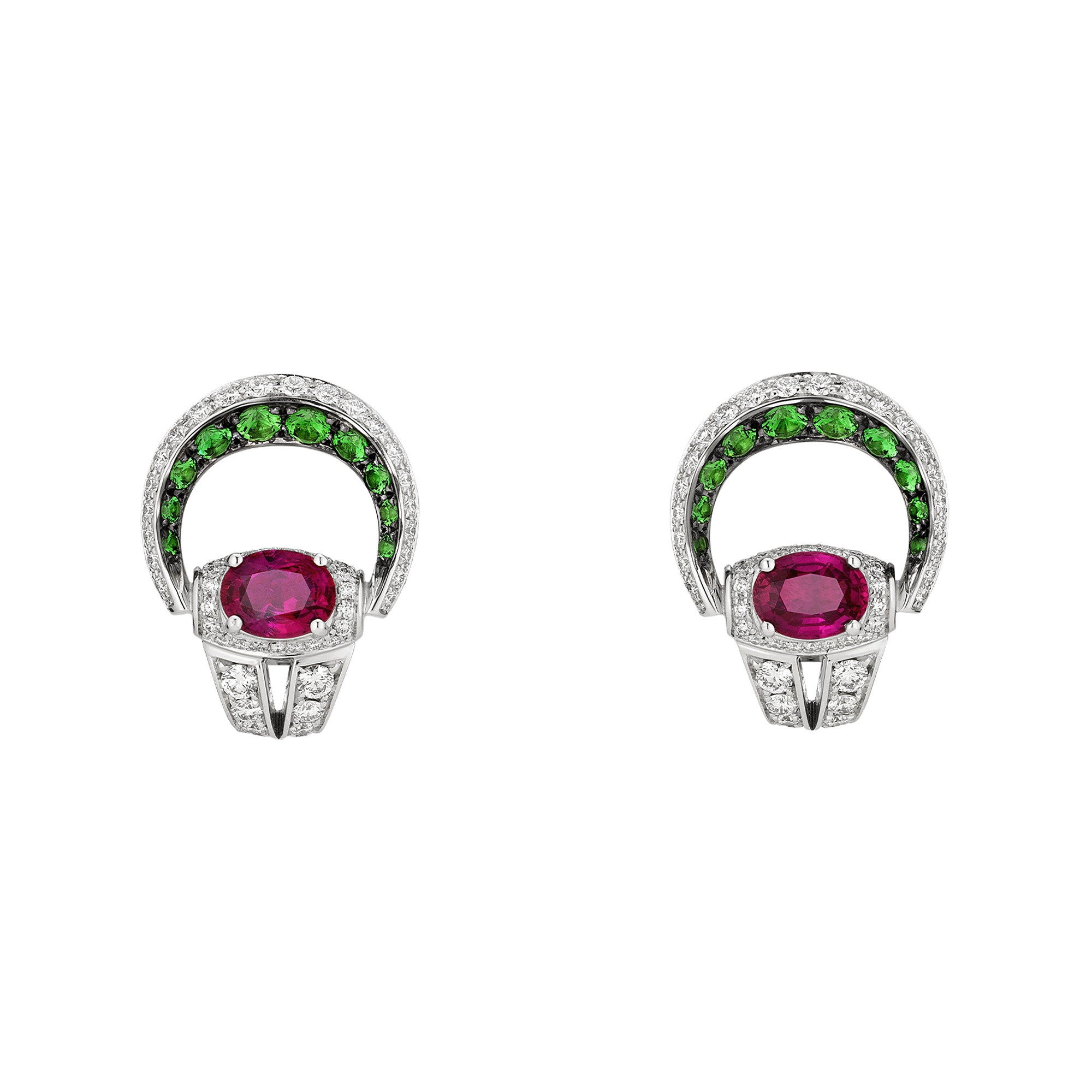 Cette paire de puces d’oreilles est sertie de deux rubis de 1,62 carat, accompagnés de tsavorites et de diamants.