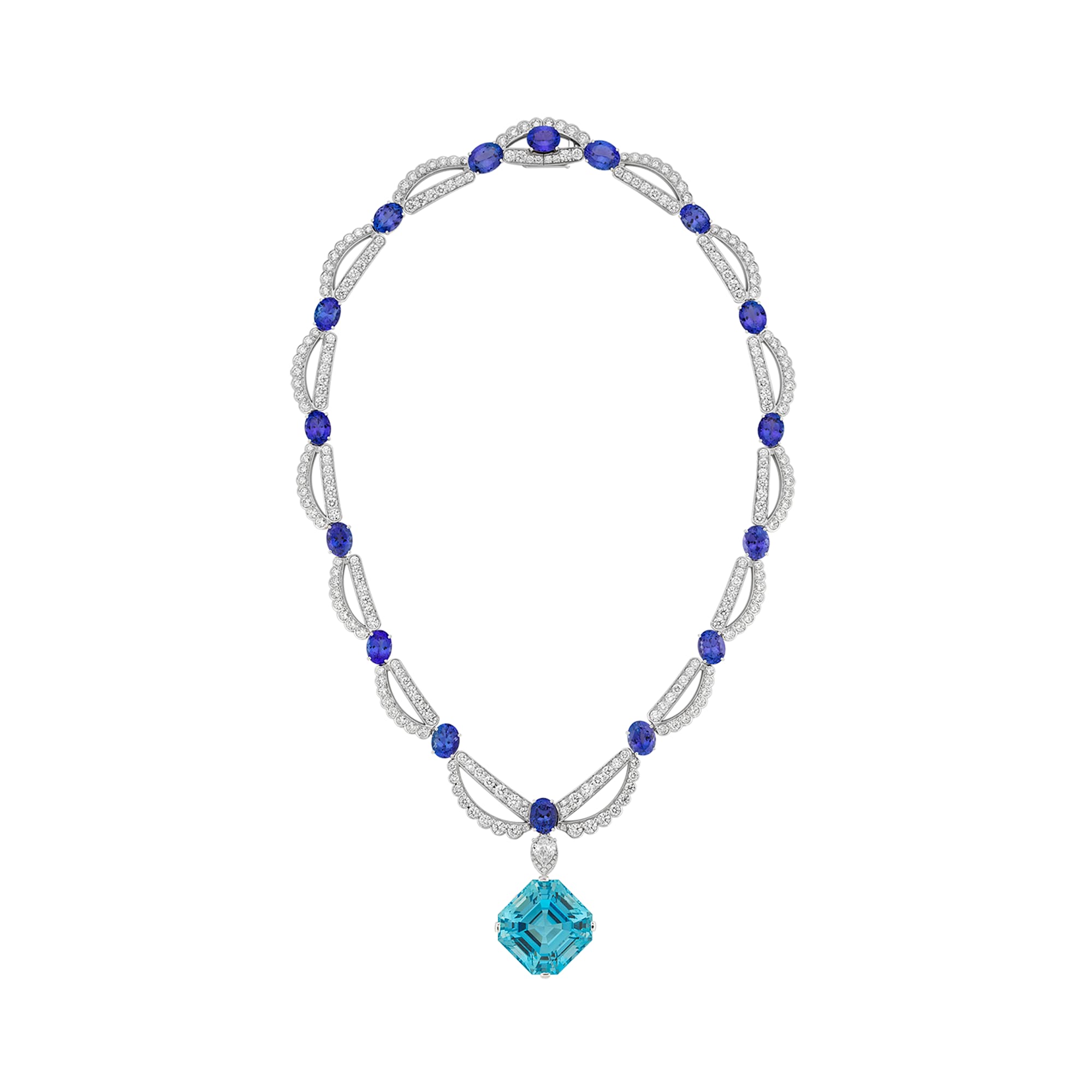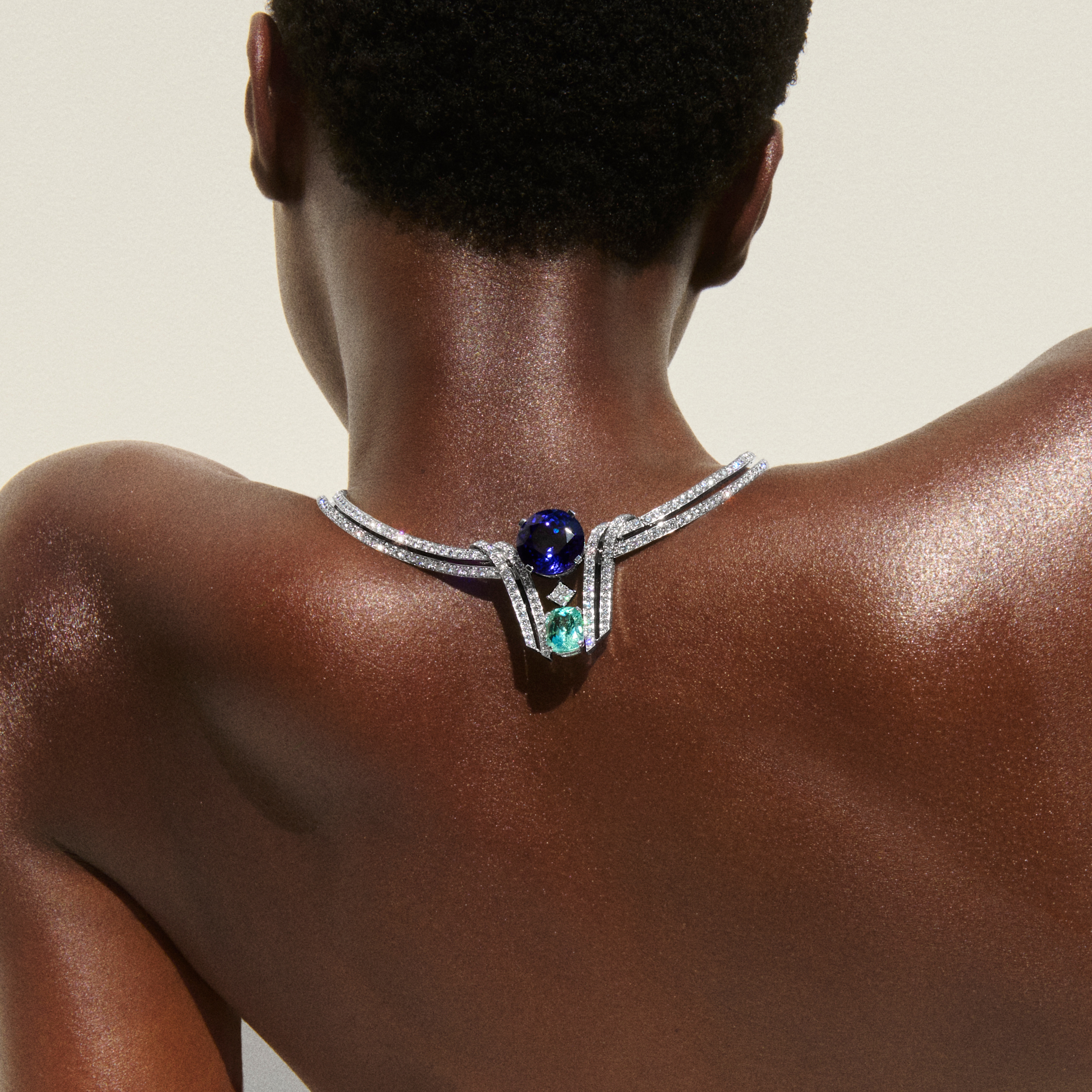 Ce collier ajusté met en scène une tanzanite ronde de 24,75 carats et une tourmaline Paraiba taille coussin de 5,94 carats, serties au cœur de cascades de diamants évoquant une fontaine au centre d’un labyrinthe enchanteur.