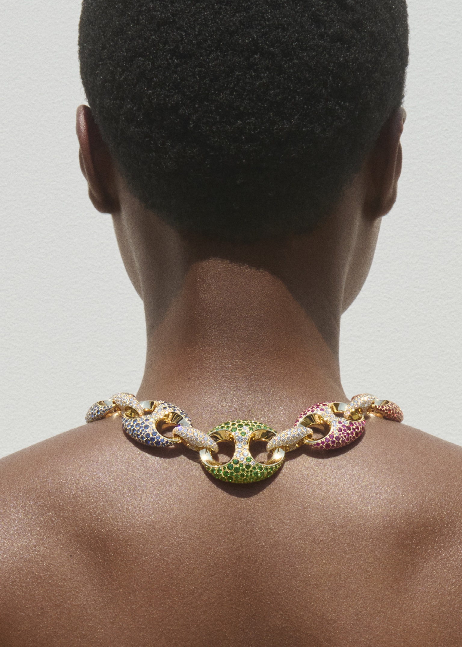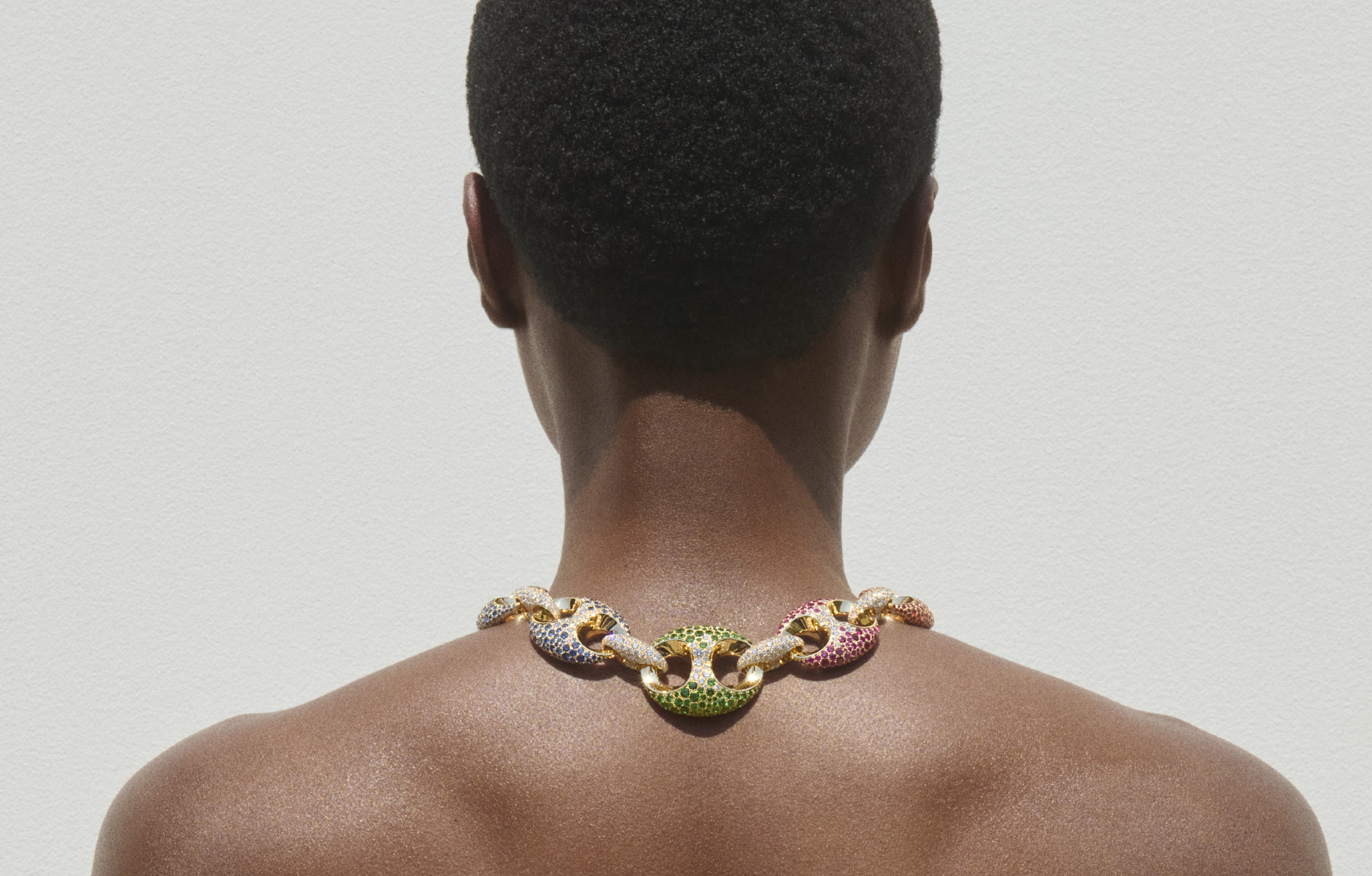 Cette collection de haute joaillerie revisite le motif nautique née dans les années 60 en explorant des effets de dégradé obtenus par la variation des tailles et des couleurs des pierres précieuses.