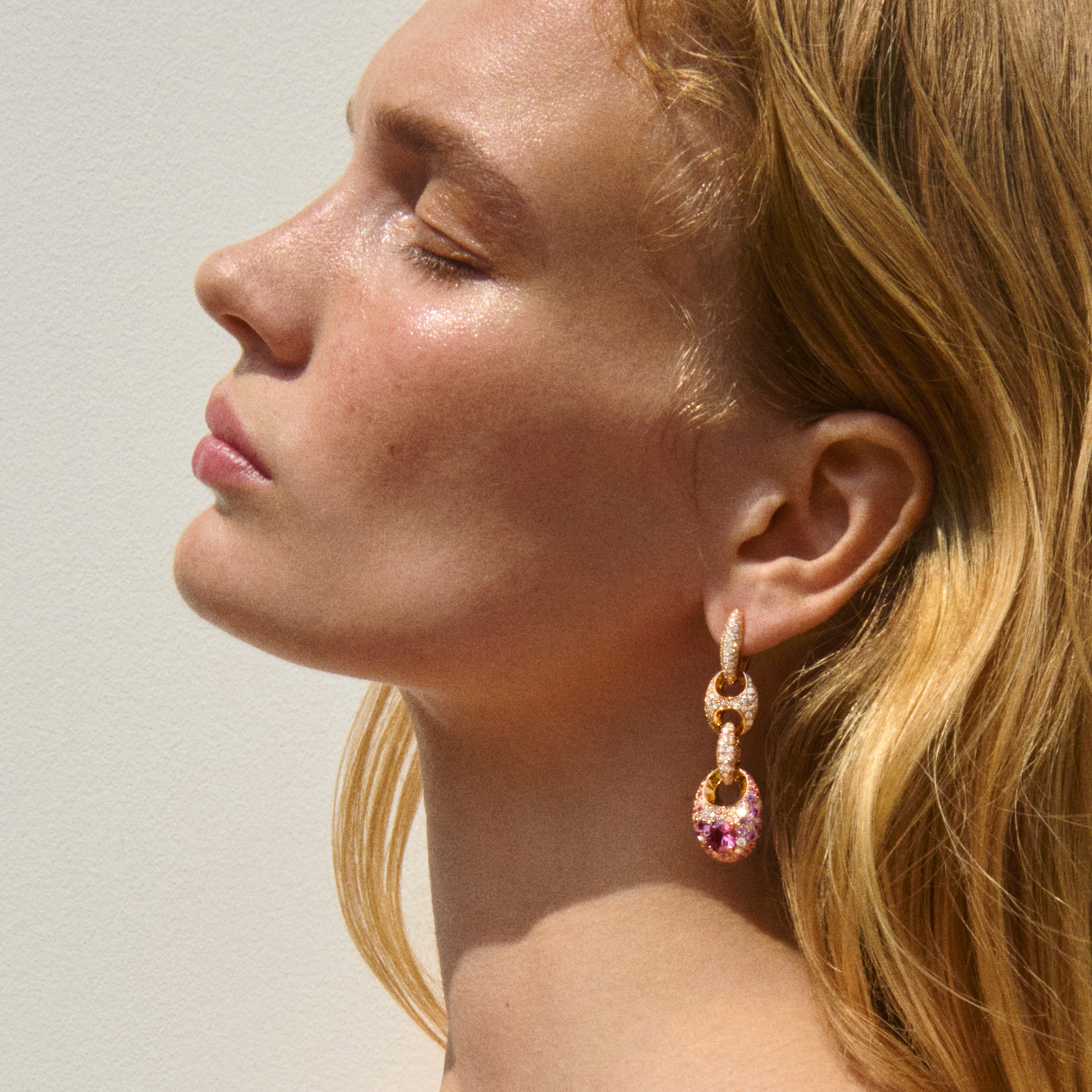 Conçues en or rose, ces boucles d’oreilles mettent en valeur un spinelle de 2,73 carats, accompagné de saphirs roses et de diamants agencés selon des lignes uniques.
