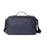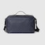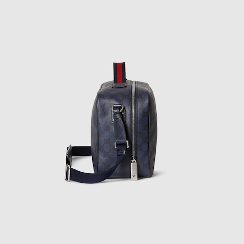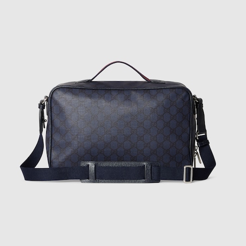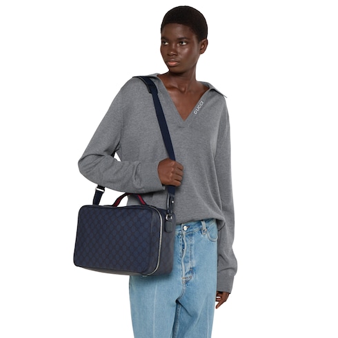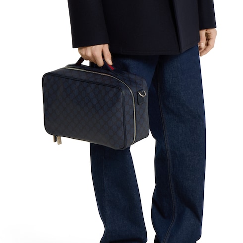 Une toile GG Supreme plus douce agrémente les pièces de la collection Gucci Tennis et se décline dans une nouvelle teinte de bleu foncé. Confectionnée dans une variante de la matière, cette pochette à chaussures est agrémentée d’une bande Web bleu et rouge.