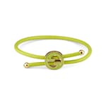 Part of the fashion jewelry line for Pre-Fall 2025, leather bracelets feature a tubular silhouette and a tonal enamel detail engraved with the Round Interlocking G. Gold-toned elements and an adjustable sliding closure complete the design. This variation appears in light pink leather.