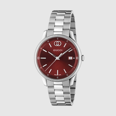For the latest collections, the G-Timeless line is reimagined with a fresh color palette, highlighting the signature motifs of the House. Powered by a quartz movement, this watch features a stainless steel bracelet and a burgundy dial with a date opening.