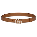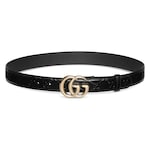 The emblematic GG motif continues to decorate leather accessories, connecting contemporary pieces to the heritage of the House. Crafted from black GG leather, this thin belt is defined by the Double G buckle in light gold-toned.