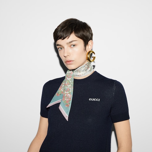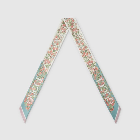 Colorful floral prints of the House's silk accessories begin with hand-drawn patterns This acquamarine and pink silk ribbon has an all-over floral print together with stripes and a bold depiction of the name of the House features on both ends.