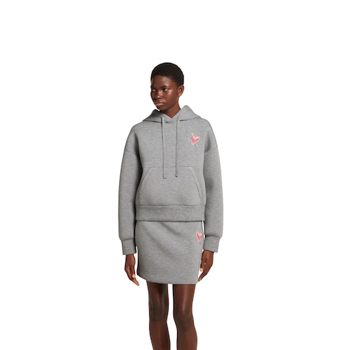 In the Pre-Fall 2025 collection, Korean artist Inji Seo‘s whimsical motifs adorn women’s ready-to-wear and small leathergoods. Crafted from grey viscose double jersey, this sweatshirt features a print on the back and an embroidered patch on the front.